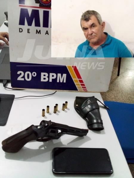 Imediatamente a guarnição da PM saiu em rondas e tiveram êxito em localizar o suspeito, Gilmar Bernandes Prestes em uma estrada vicinal cerca de 05 km da cidade, onde foi abordado pelos policiais e encontrado em sua cintura um revólver calibre 38.