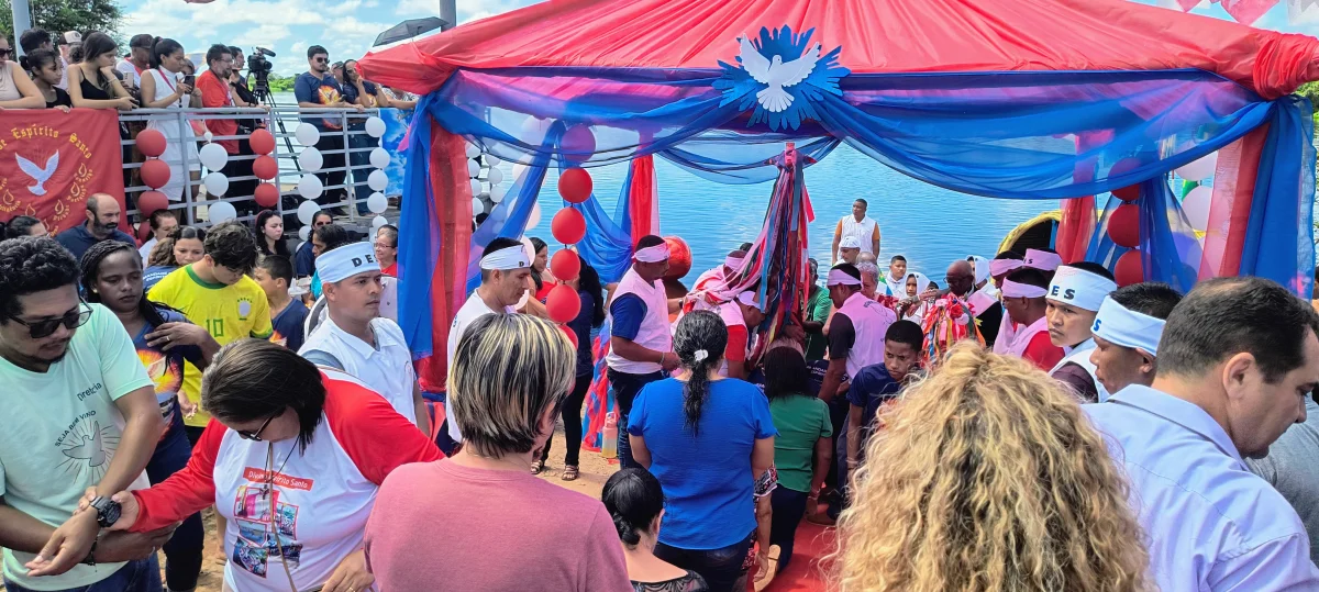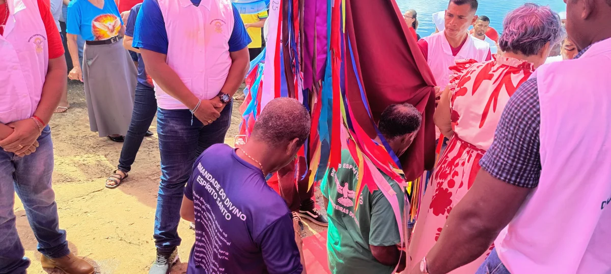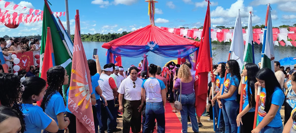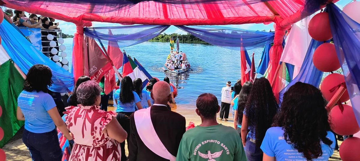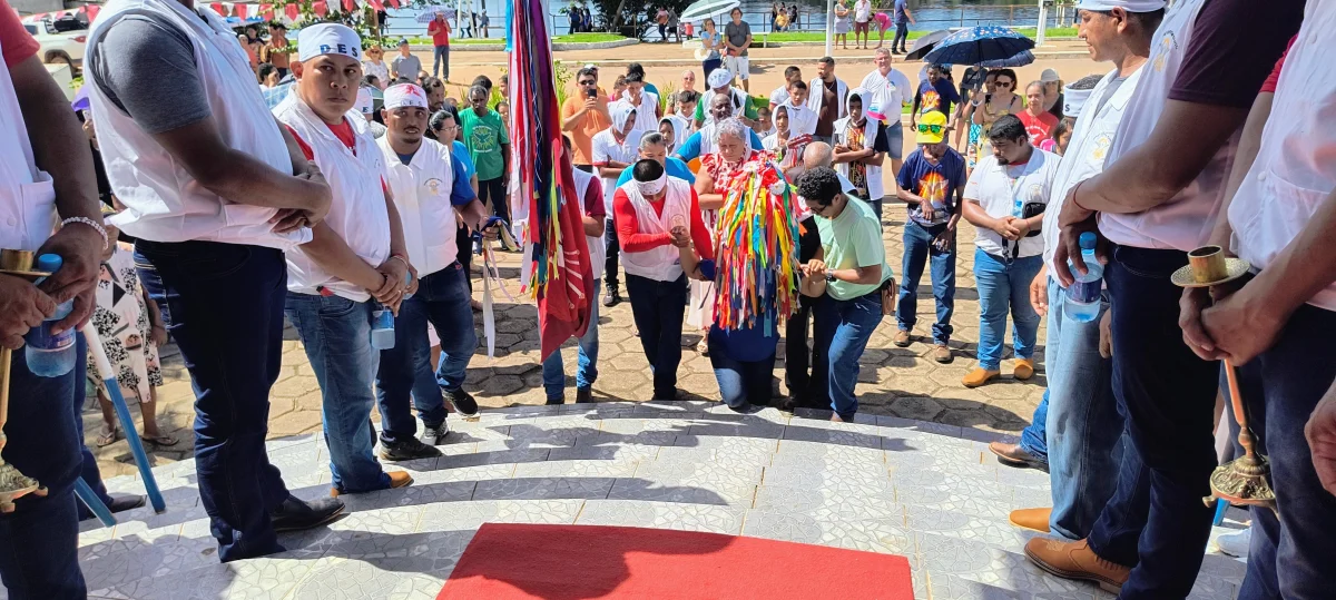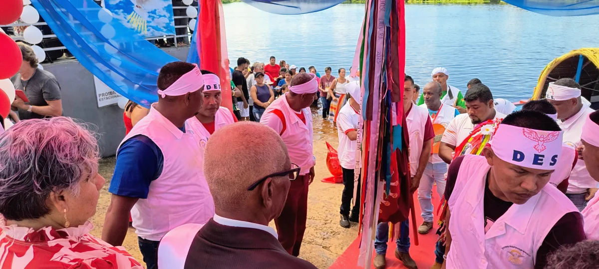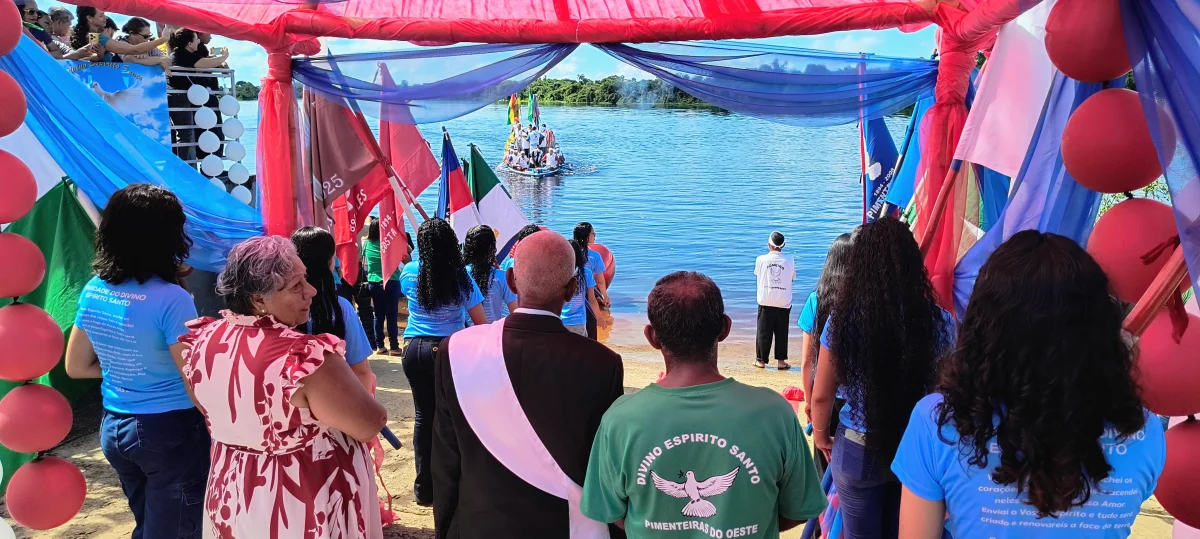 Centenas de pessoas foram às margens do Rio Guaporé para recepcionar a Coroa, Cetro Bandeira e Mastro do Divino Espírito Santo
