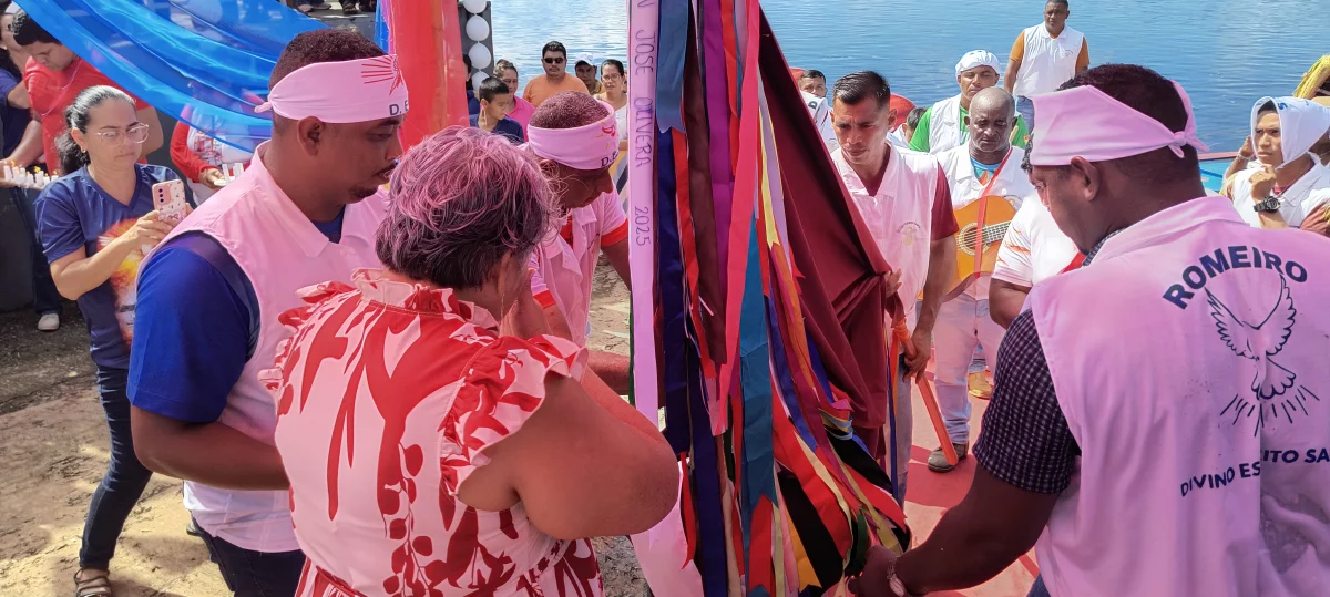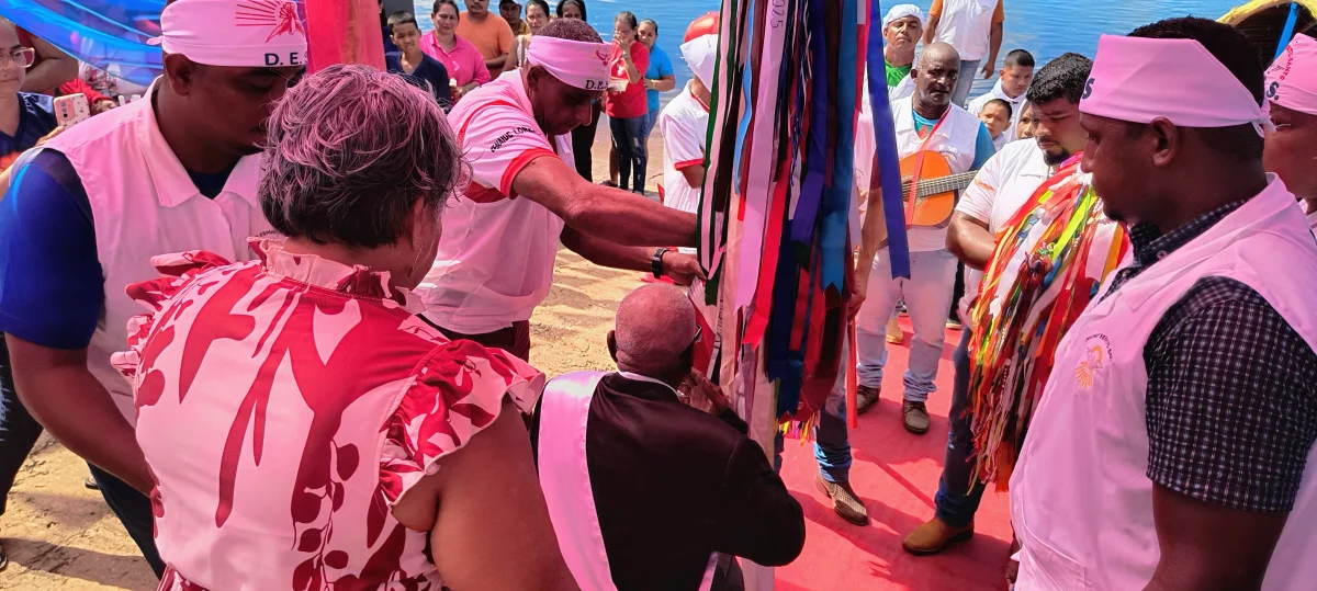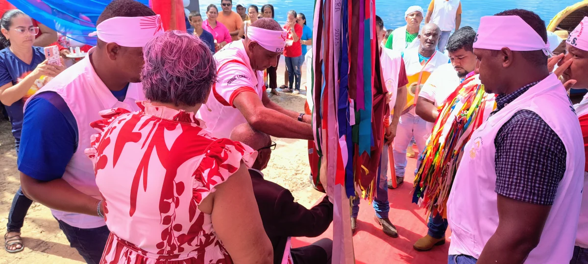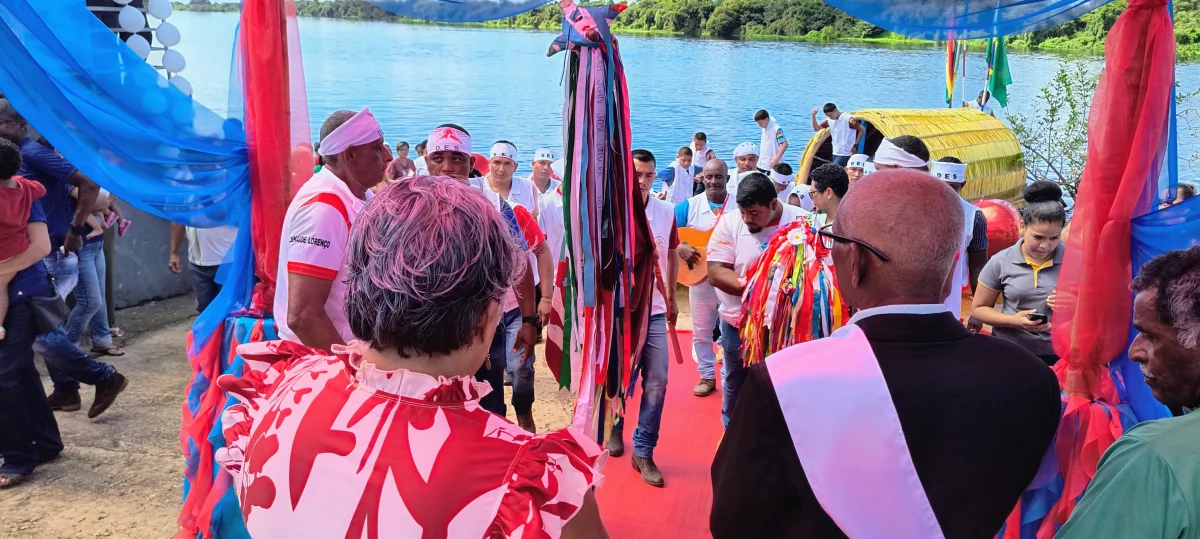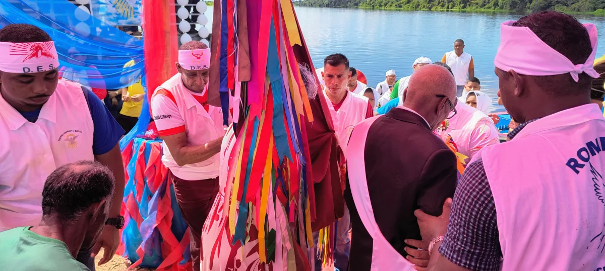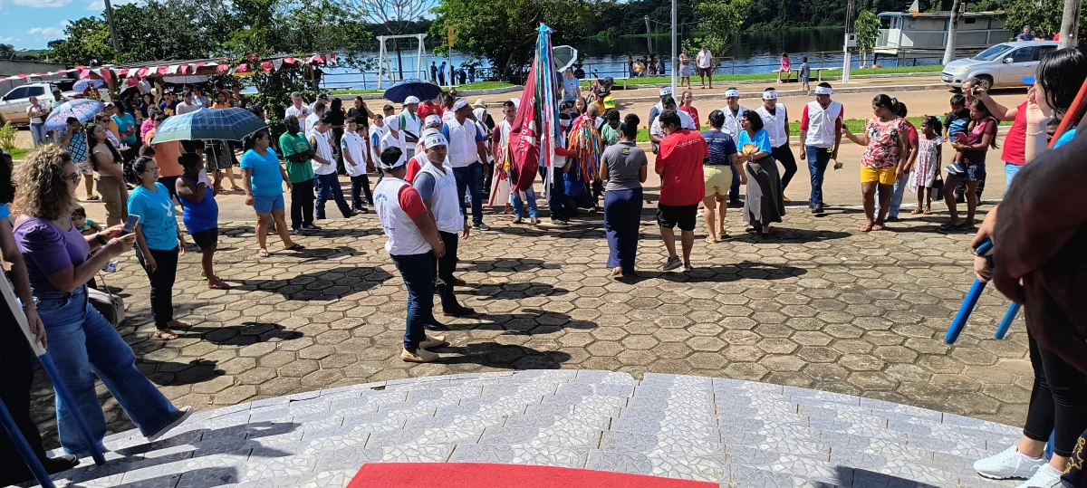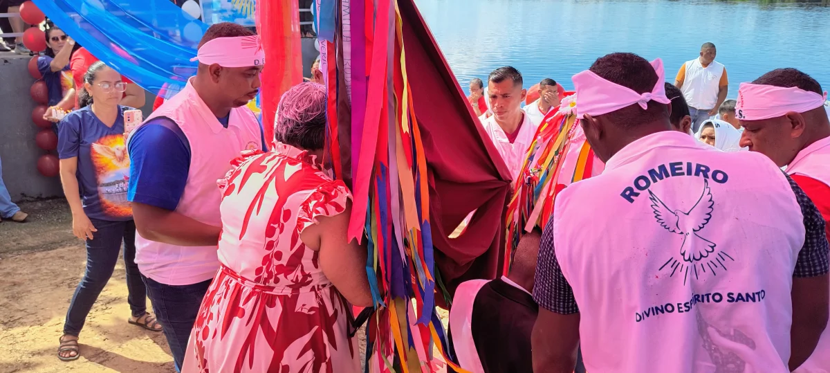 Centenas de pessoas foram às margens do Rio Guaporé para recepcionar a Coroa, Cetro Bandeira e Mastro do Divino Espírito Santo