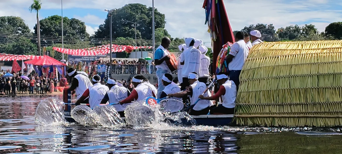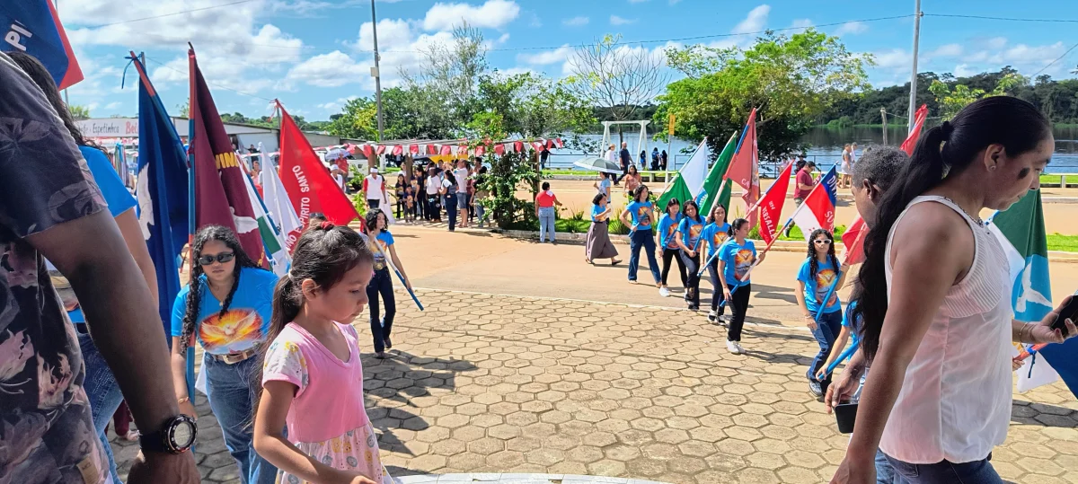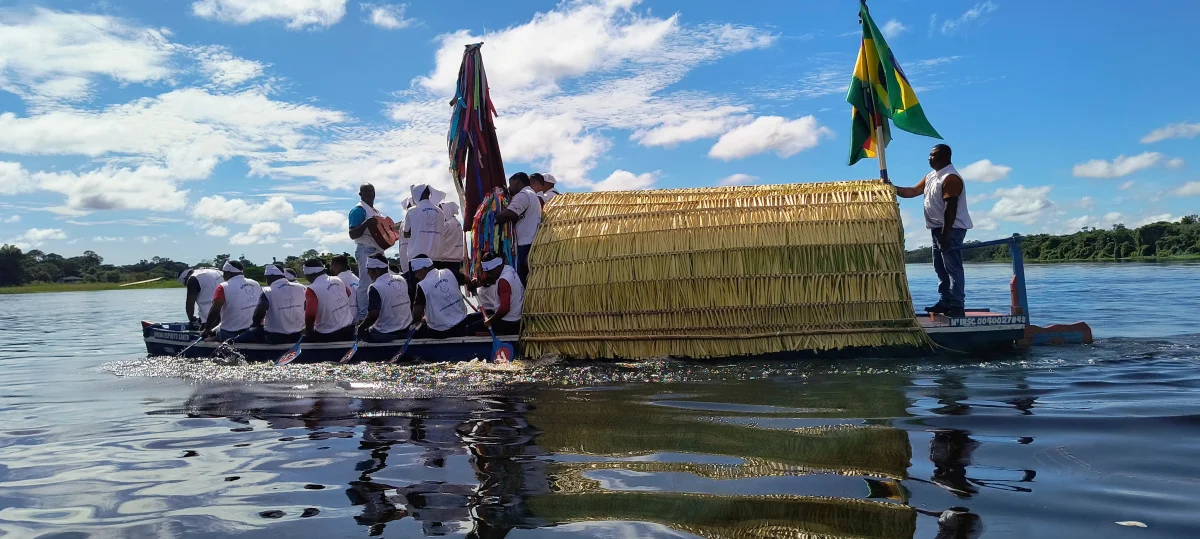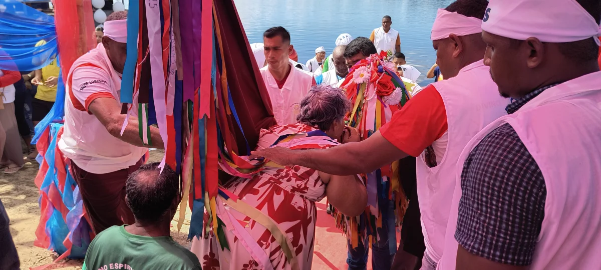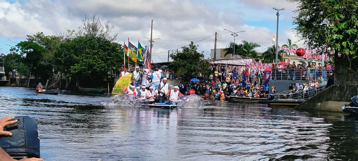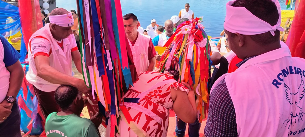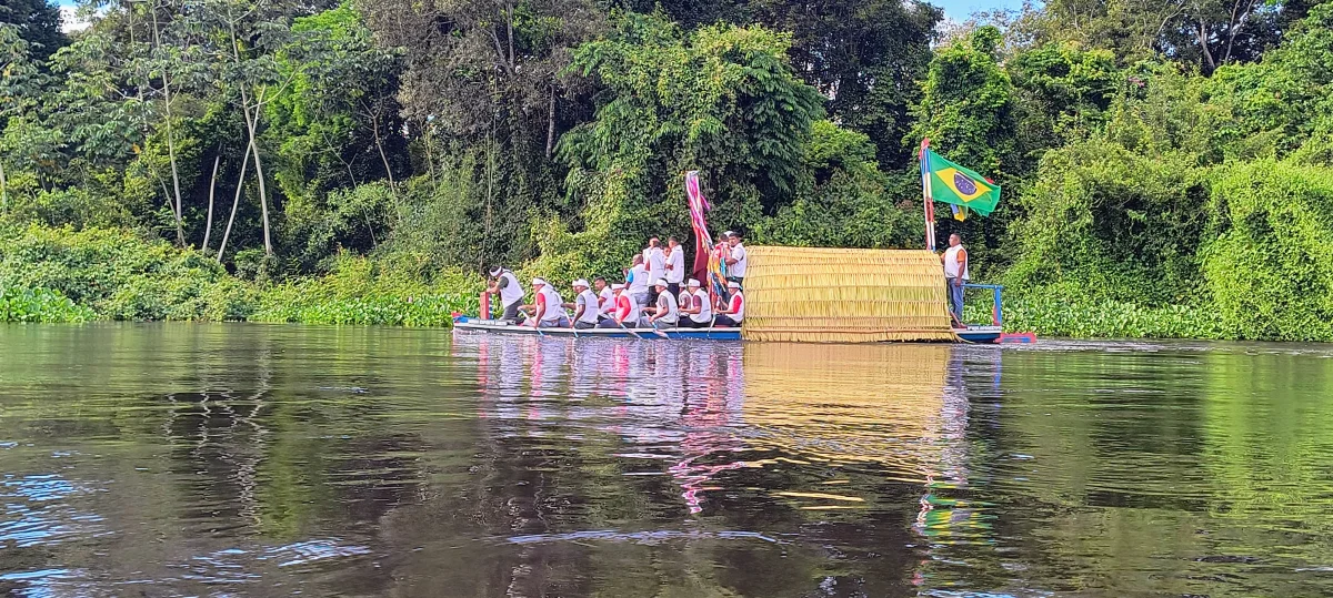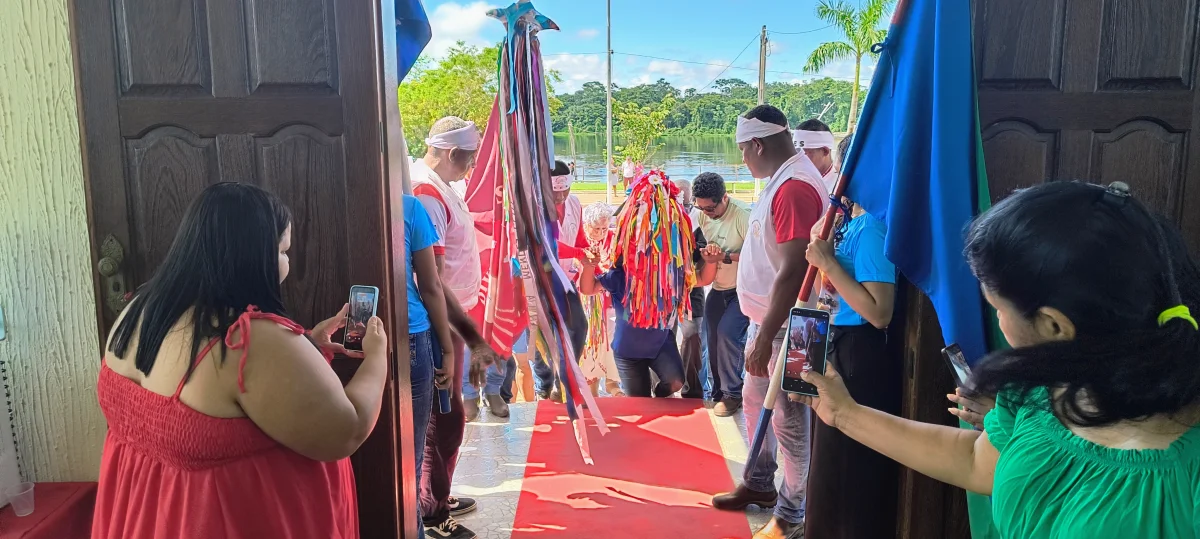 Centenas de pessoas foram às margens do Rio Guaporé para recepcionar a Coroa, Cetro Bandeira e Mastro do Divino Espírito Santo