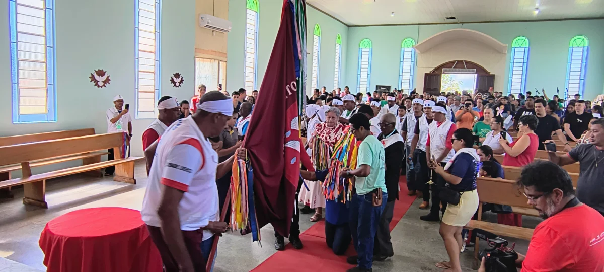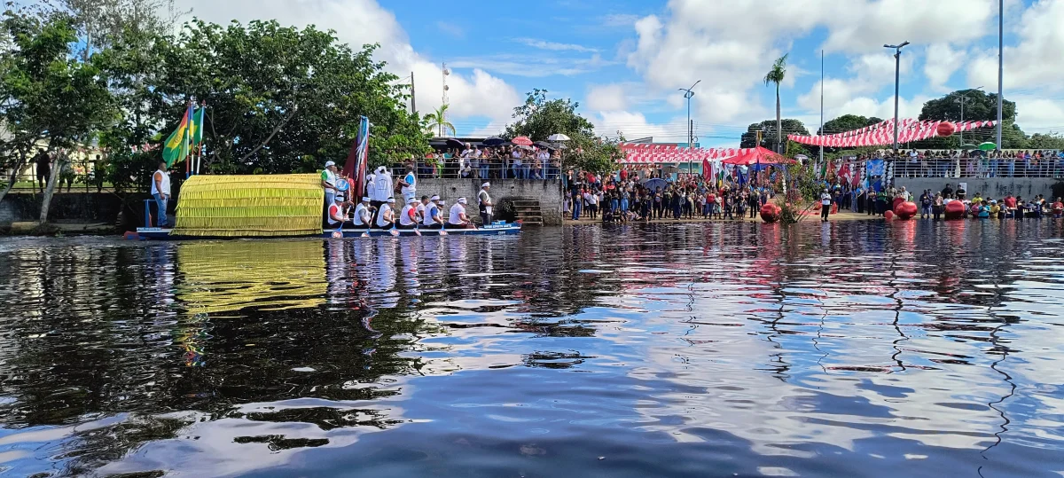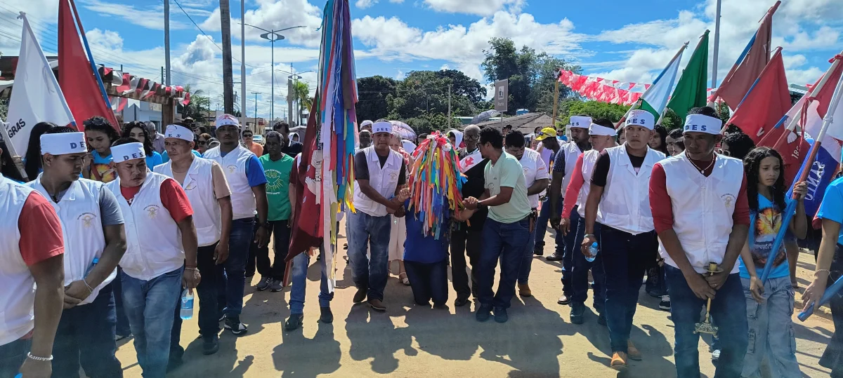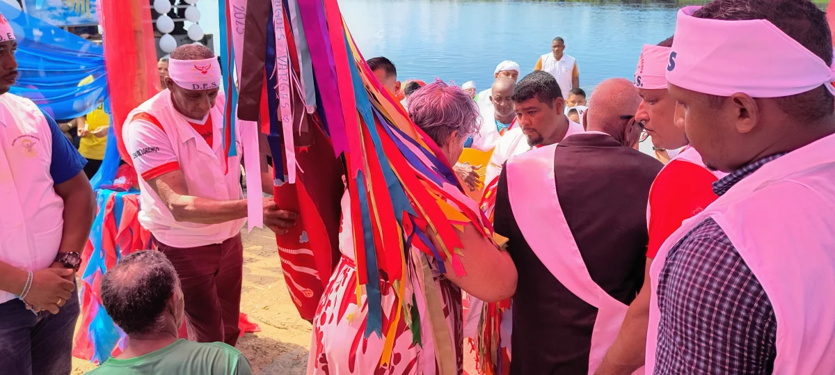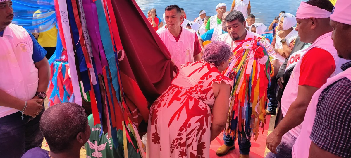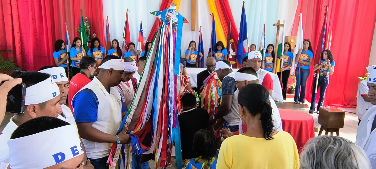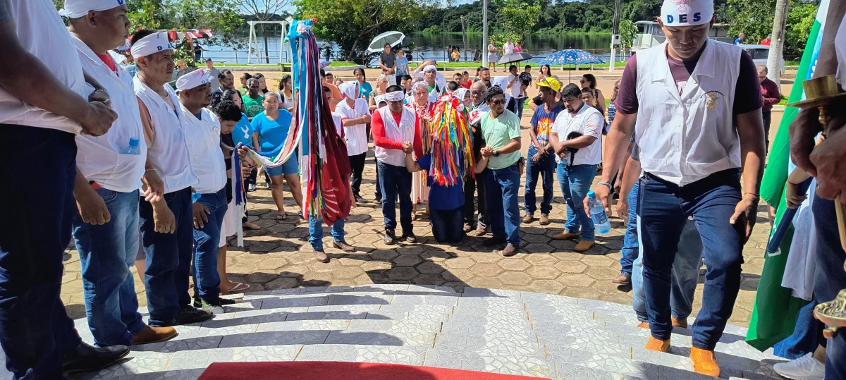 Centenas de pessoas foram às margens do Rio Guaporé para recepcionar a Coroa, Cetro Bandeira e Mastro do Divino Espírito Santo
