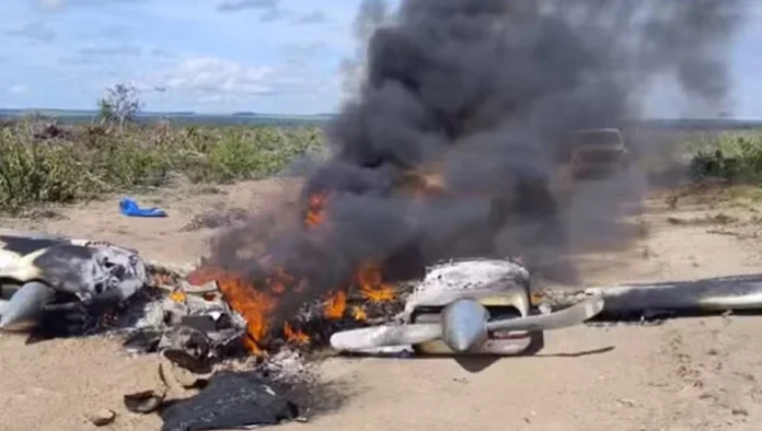 Polícia apontou indícios de que o piloto fez um pouso forçado na fazenda e ateou fogo na aeronave, porque encontraram galões de gasolina próximos da queda.