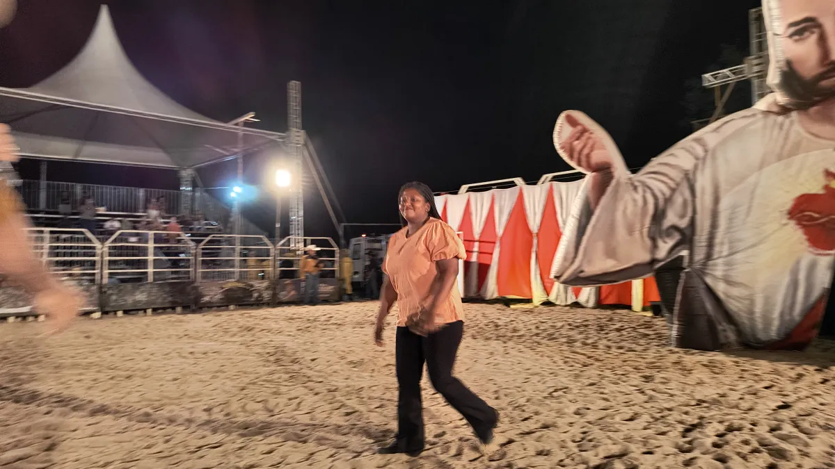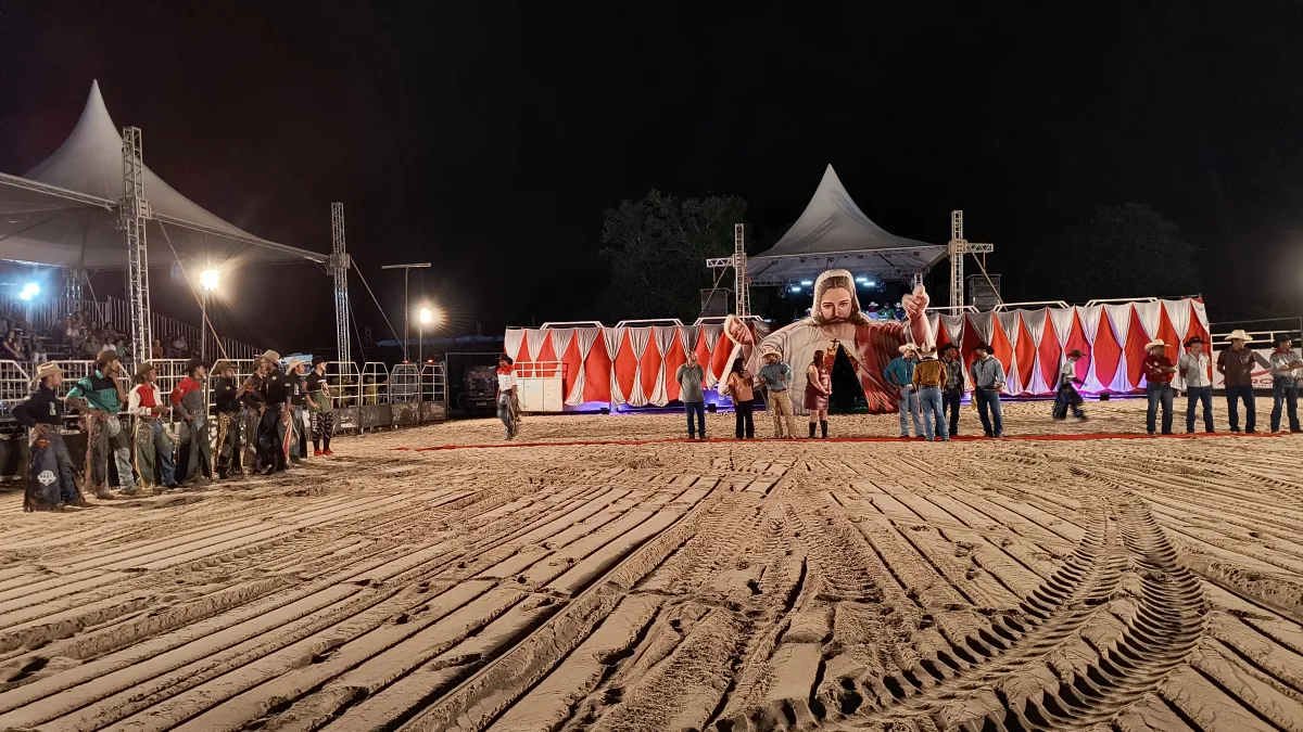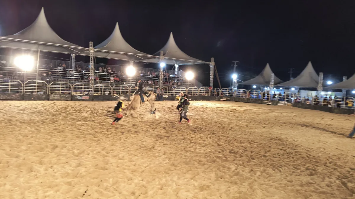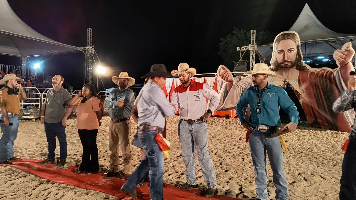 O narrador convidou as autoridades presentes e os peões entrarem na arena e se apresentarem para o público.