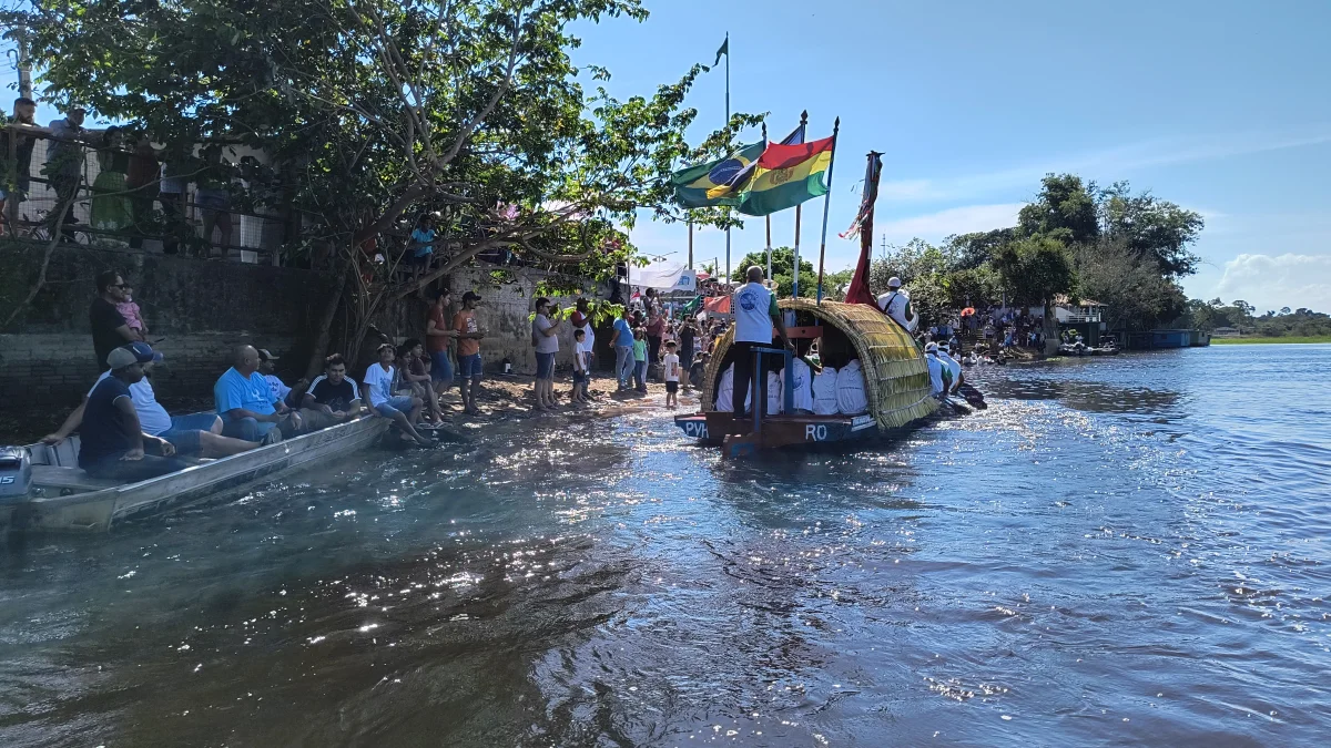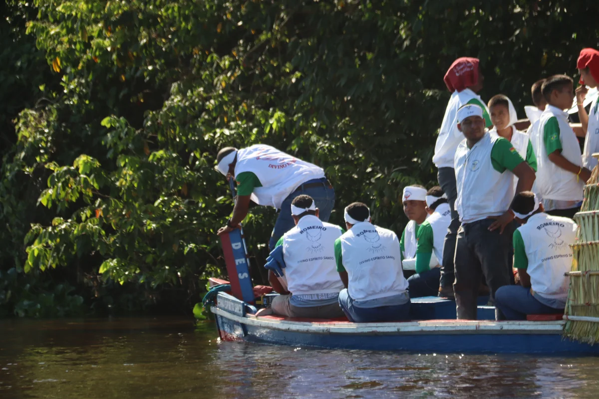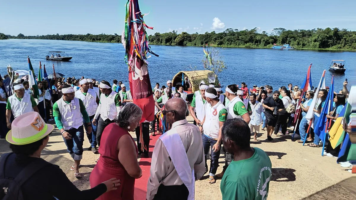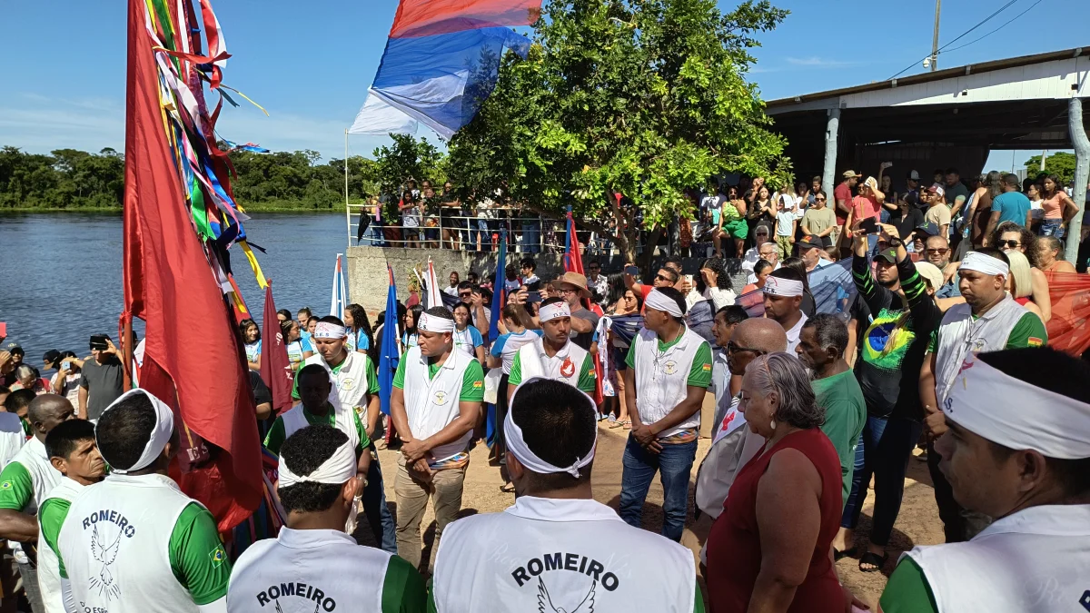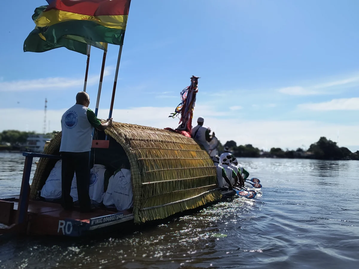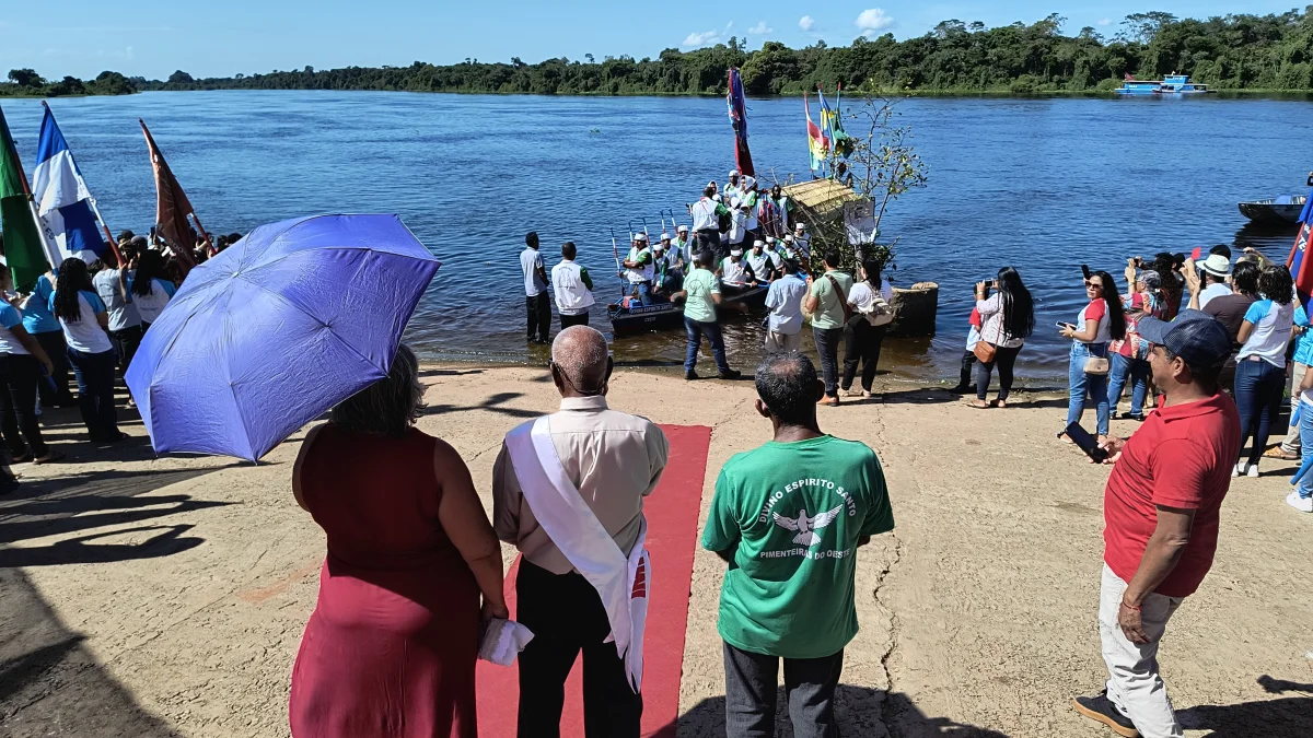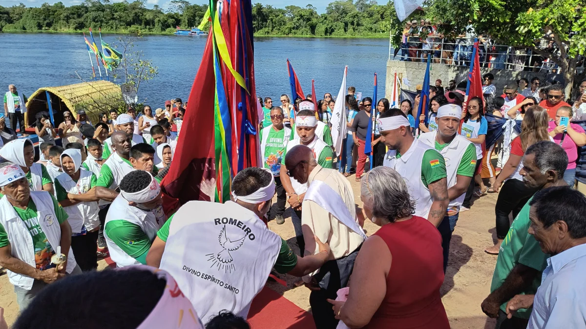 Aconteceu neste domingo 25 de maio, a chegada da Romaria e do Batelão do Divino Espírito Santo, do Vale do Guaporé, no município de Pimenteiras do Oeste/RO; São 45 dias de romarias por 37 comunidades tradicionais do Rio Guaporé, entre o Brasil e Bolívia até chegar a seu destino final que será na localidade de Cafetal na Bolívia que será uma grande festa nos dias 04,05,06, 07 e 08 de junho de 2025.