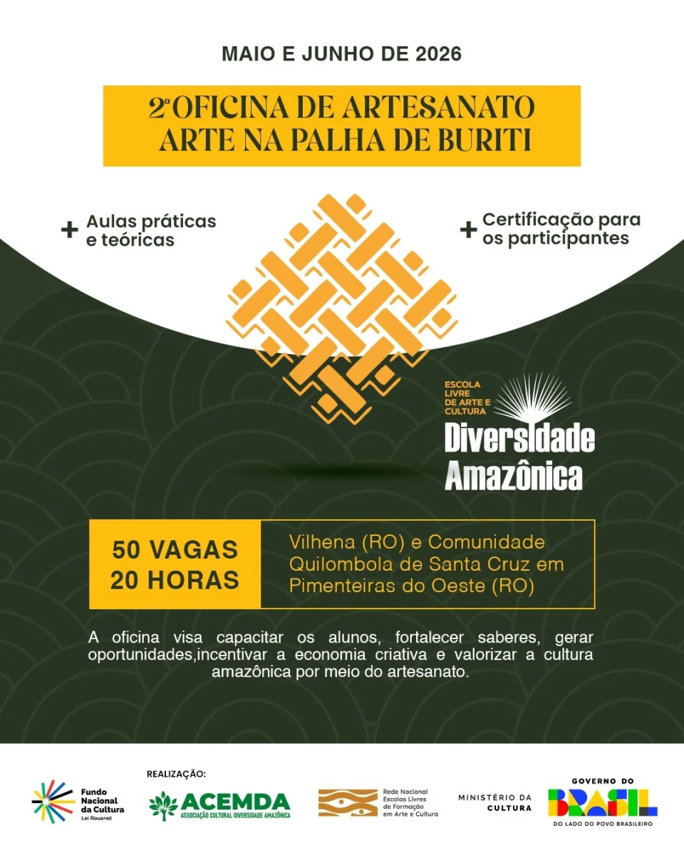 A Escola Livre de Arte e Cultura Diversidade Amazônica, coordenada pela Associação Cultural, Educação, Meio Ambiente e Desenvolvimento Sustentável Diversidade Amazônica (ACEMDA), realiza entre os meses de maio e junho de 2026 a 2ª Oficina de Artesanato Arte na Palha de Buriti. A iniciativa é gratuita e voltada para alunos de Vilhena e da comunidade quilombola de Santa Cruz, localizada em Pimenteiras do Oeste (RO).