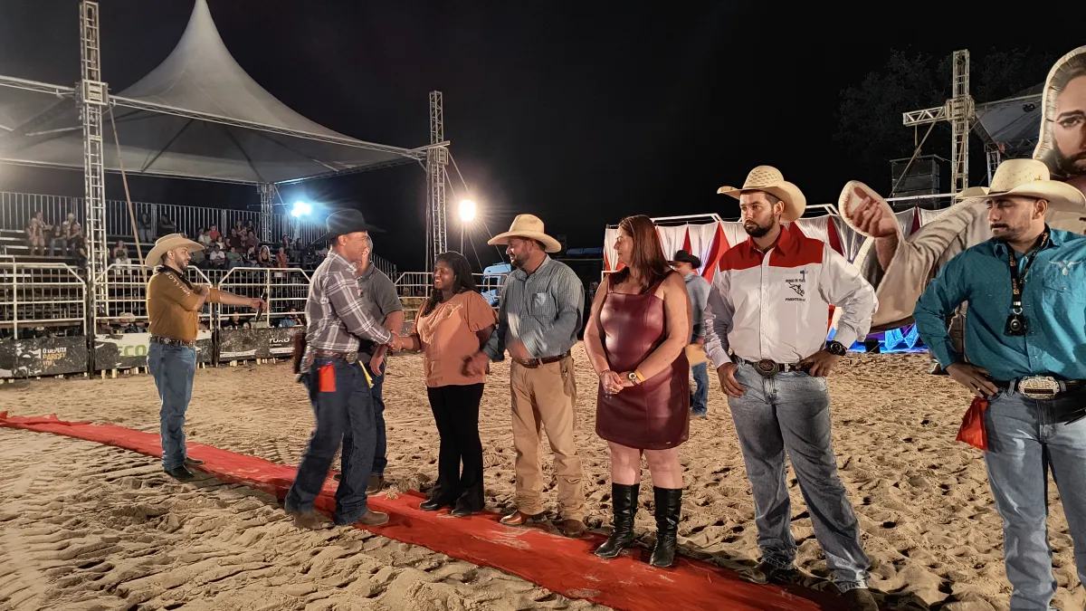 O narrador convidou as autoridades presentes e os peões entrarem na arena e se apresentarem para o público.