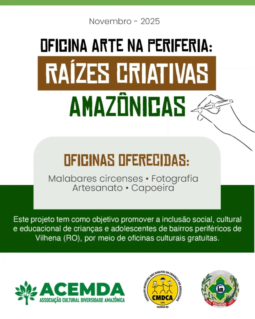 A Associação Cultural, Educação, Meio Ambiente e Desenvolvimento Sustentável Diversidade Amazônica (ACEMDA) vai promover, neste mês de novembro, o projeto “Oficina Arte na Periferia: Raízes Criativas Amazônicas”, que ofertará oficinas culturais gratuitas para cerca de 100 crianças e adolescentes da Escola Estadual Professor Luiz Carlos Paula Assis, no Setor 6 do bairro Parque São Paulo de Vilhena (RO).