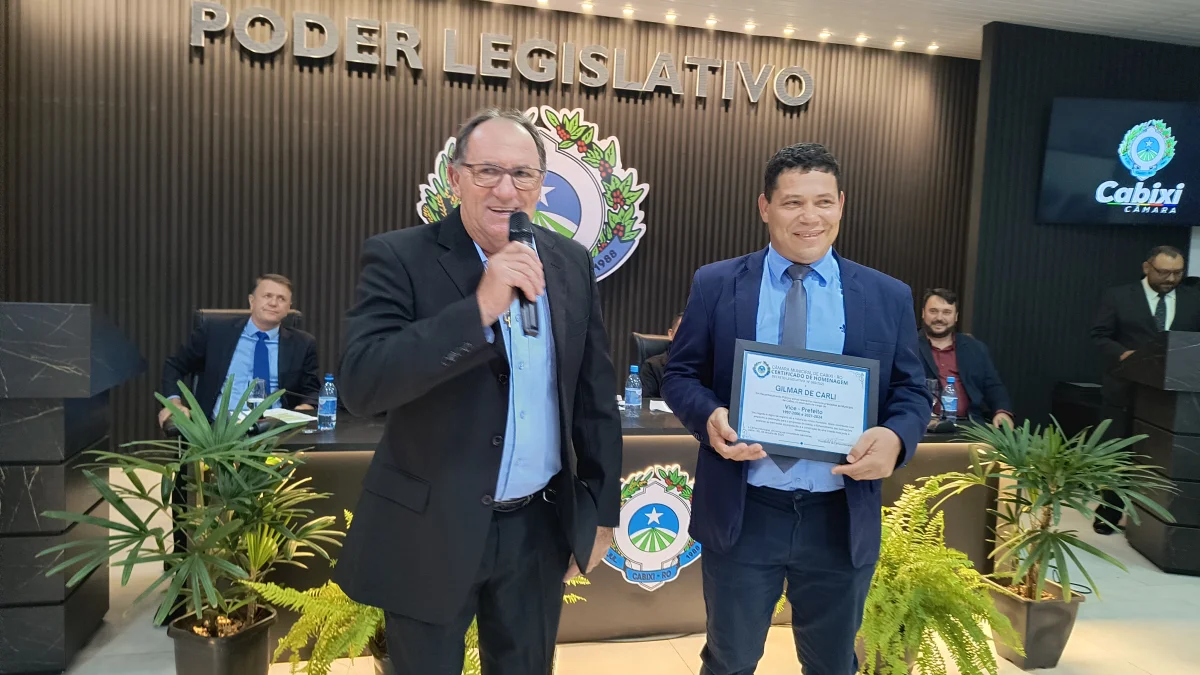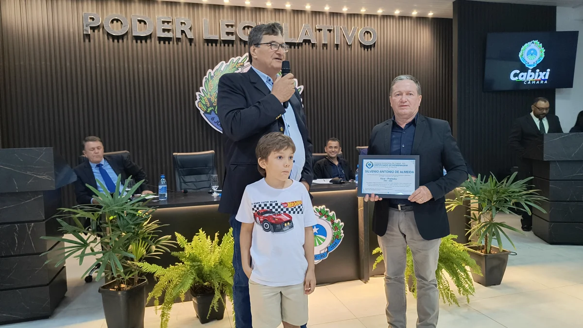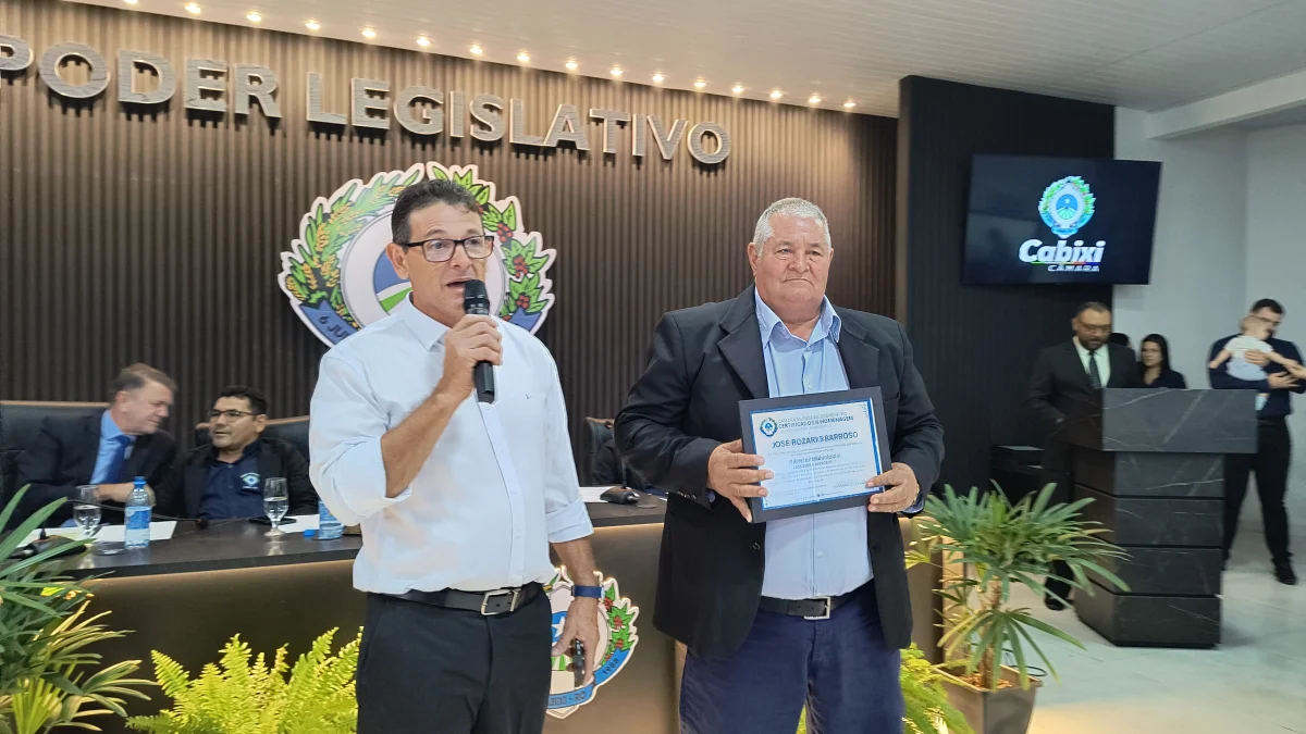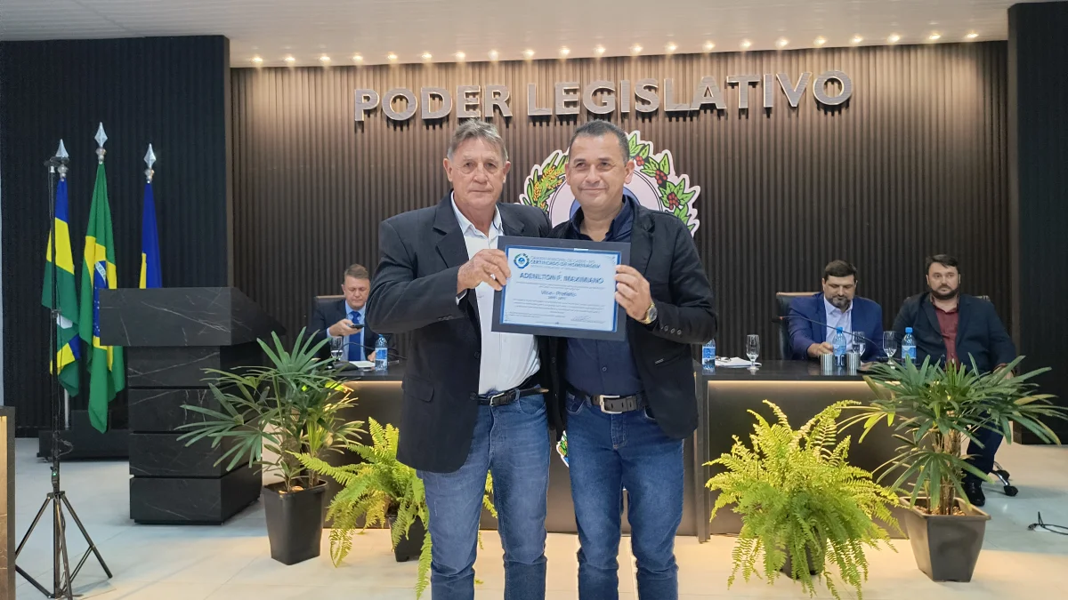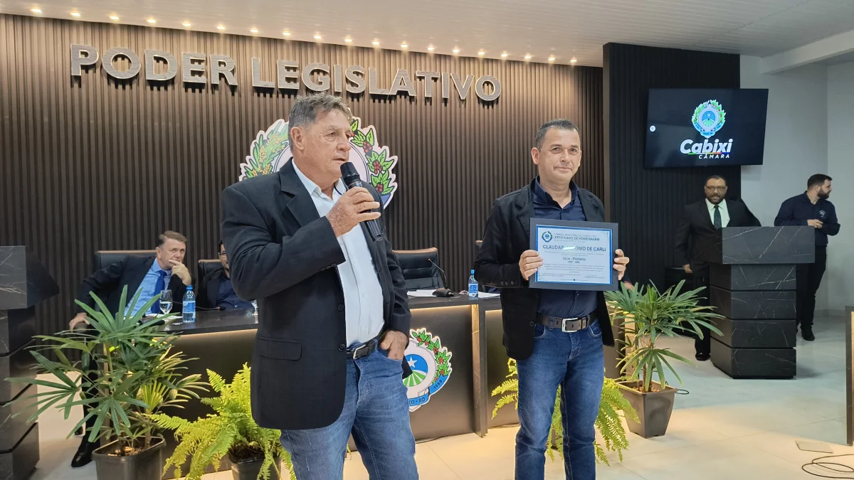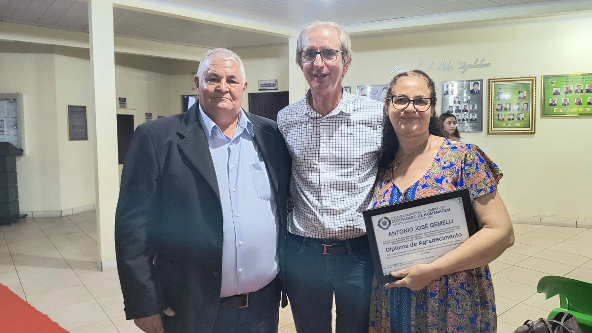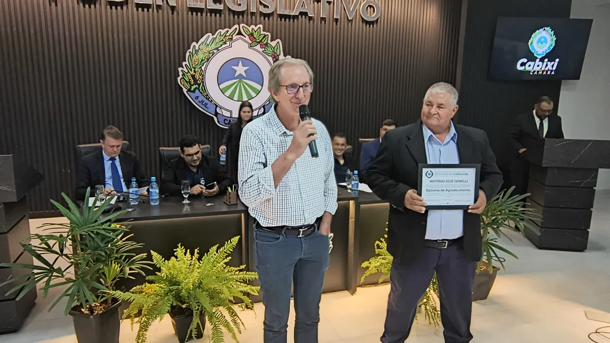 O presidente da Câmara de Vereadores do Município de Cabixi, Milton Antunes da Silva, concede homenagem ao empresário Antônio José Gemelli. A homenagem reconhece sua contribuição para o desenvolvimento econômico e social da cidade, especialmente pela geração de empregos e investimentos locais.