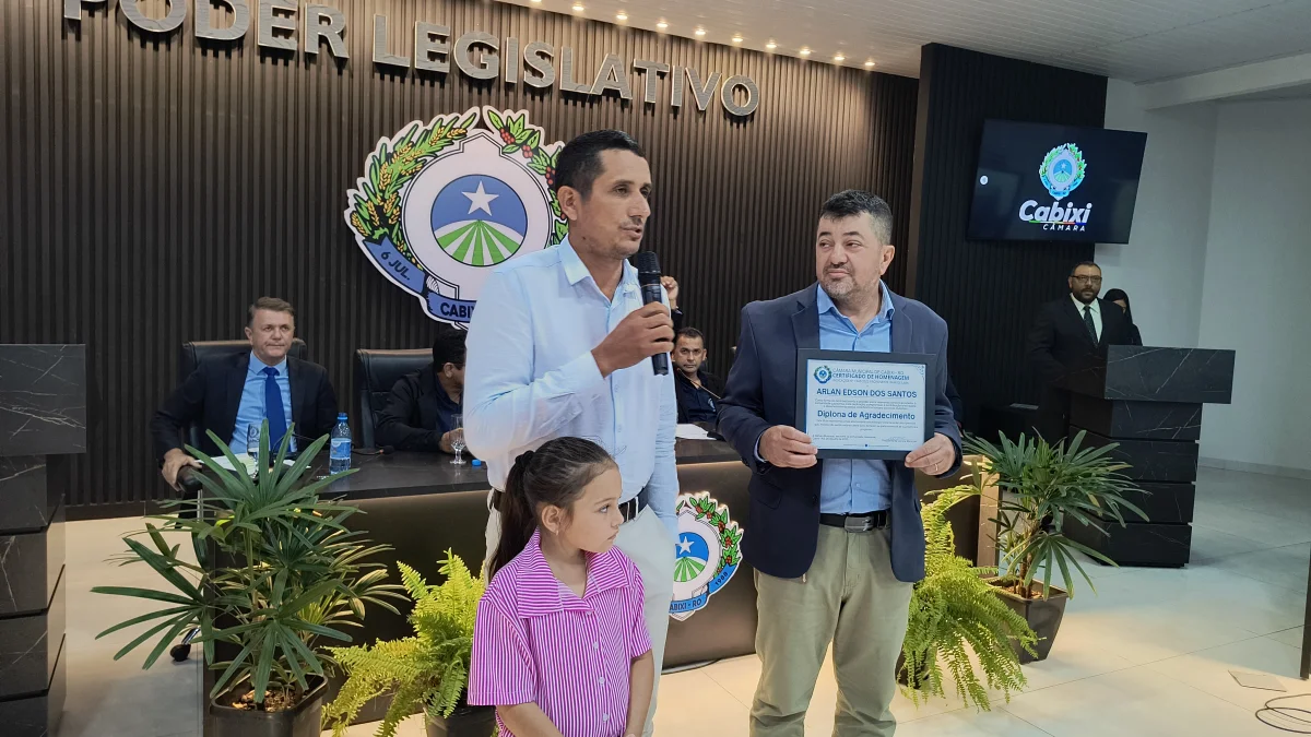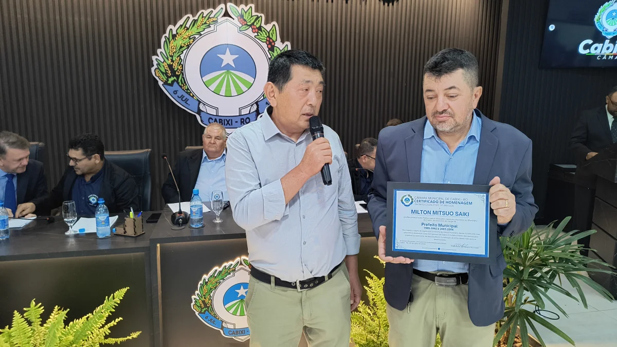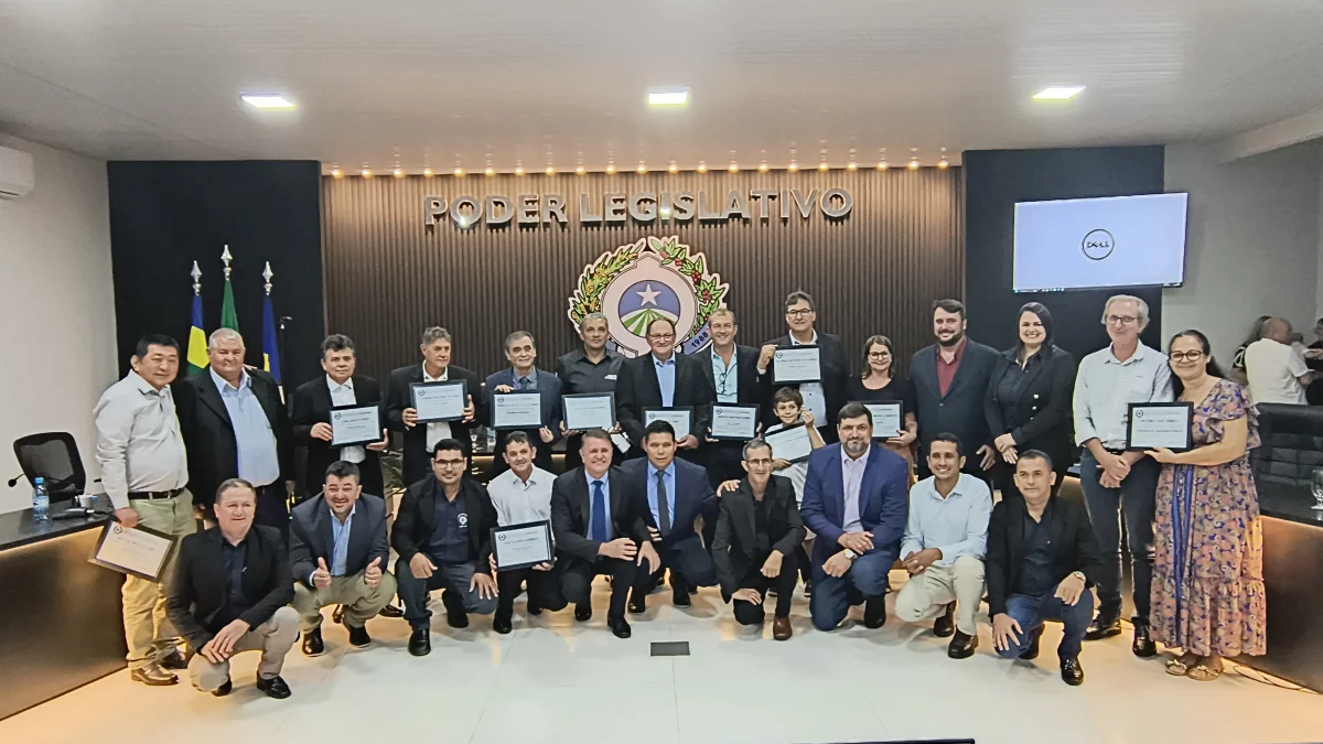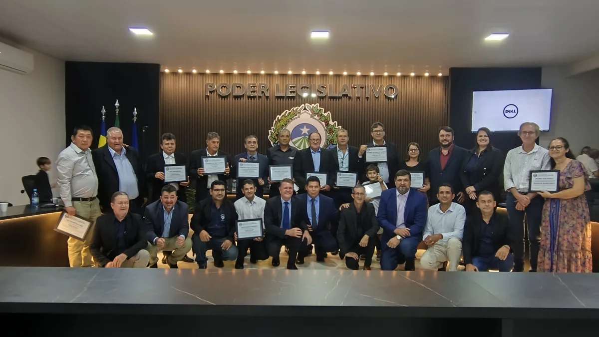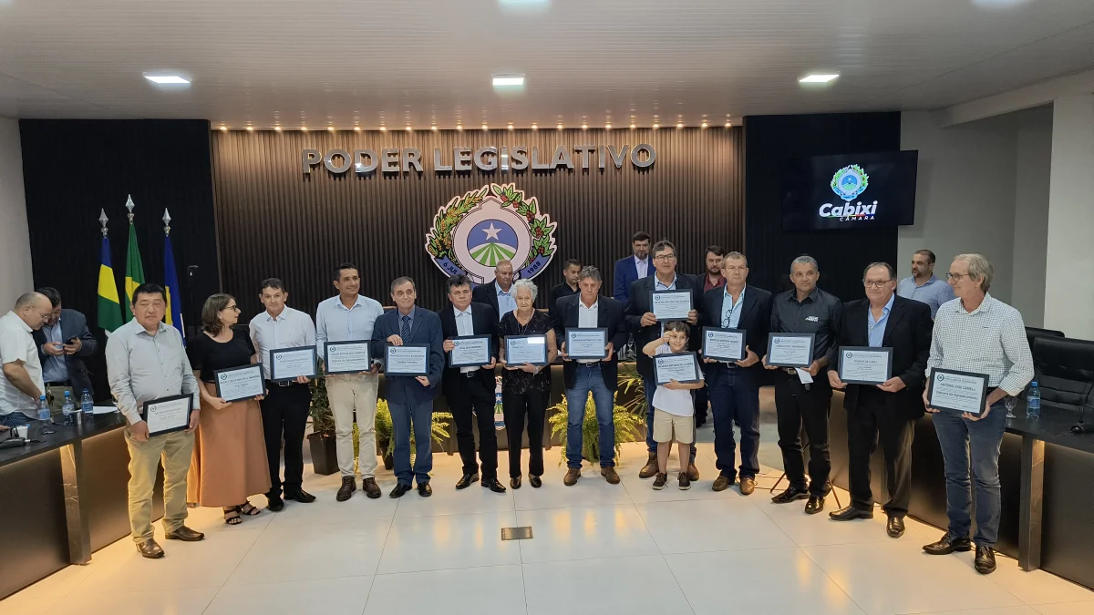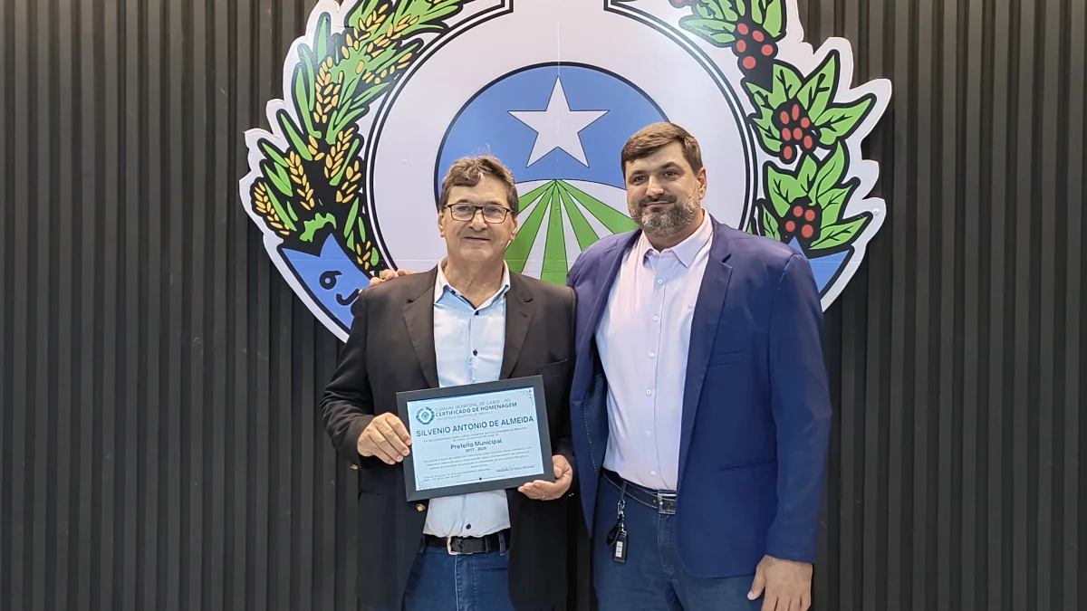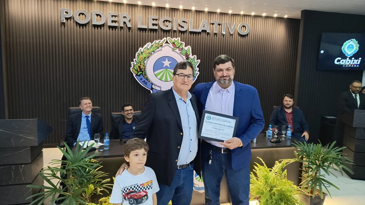 O presidente da Câmara de Vereadores do Município de Cabixi, Milton Antunes da Silva, concede homenagem ao empresário Antônio José Gemelli. A homenagem reconhece sua contribuição para o desenvolvimento econômico e social da cidade, especialmente pela geração de empregos e investimentos locais.