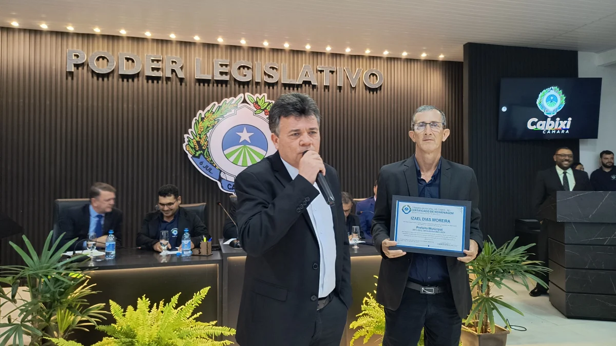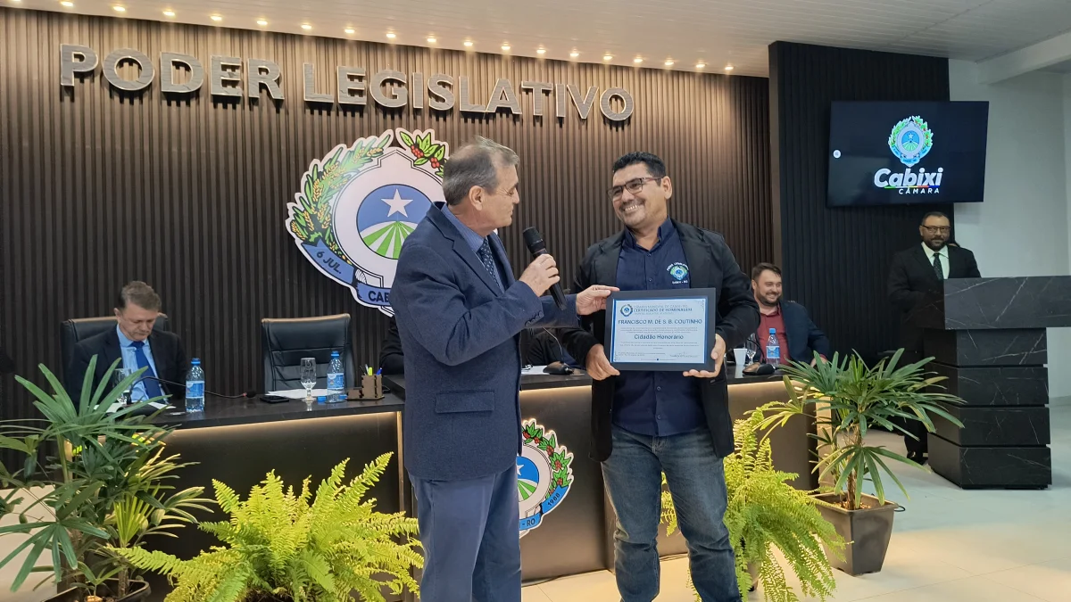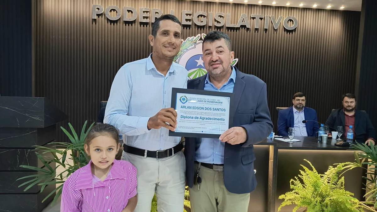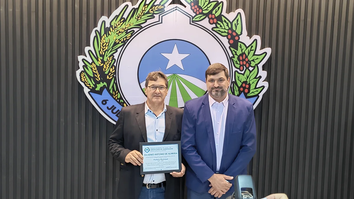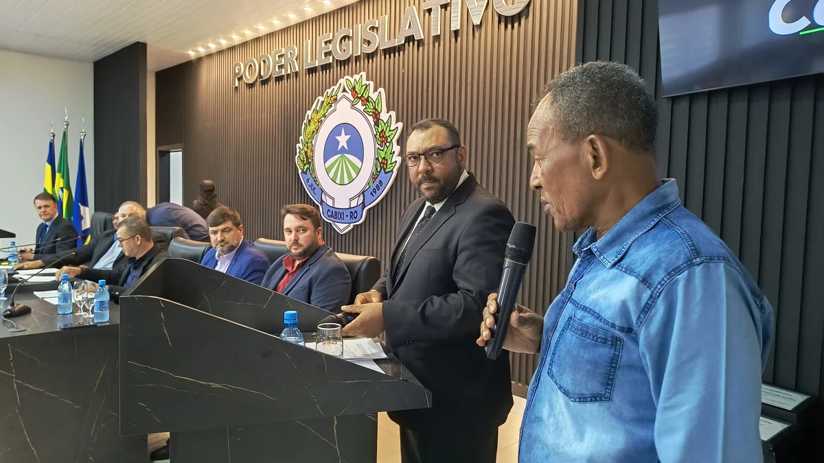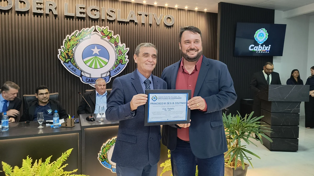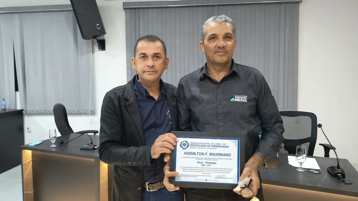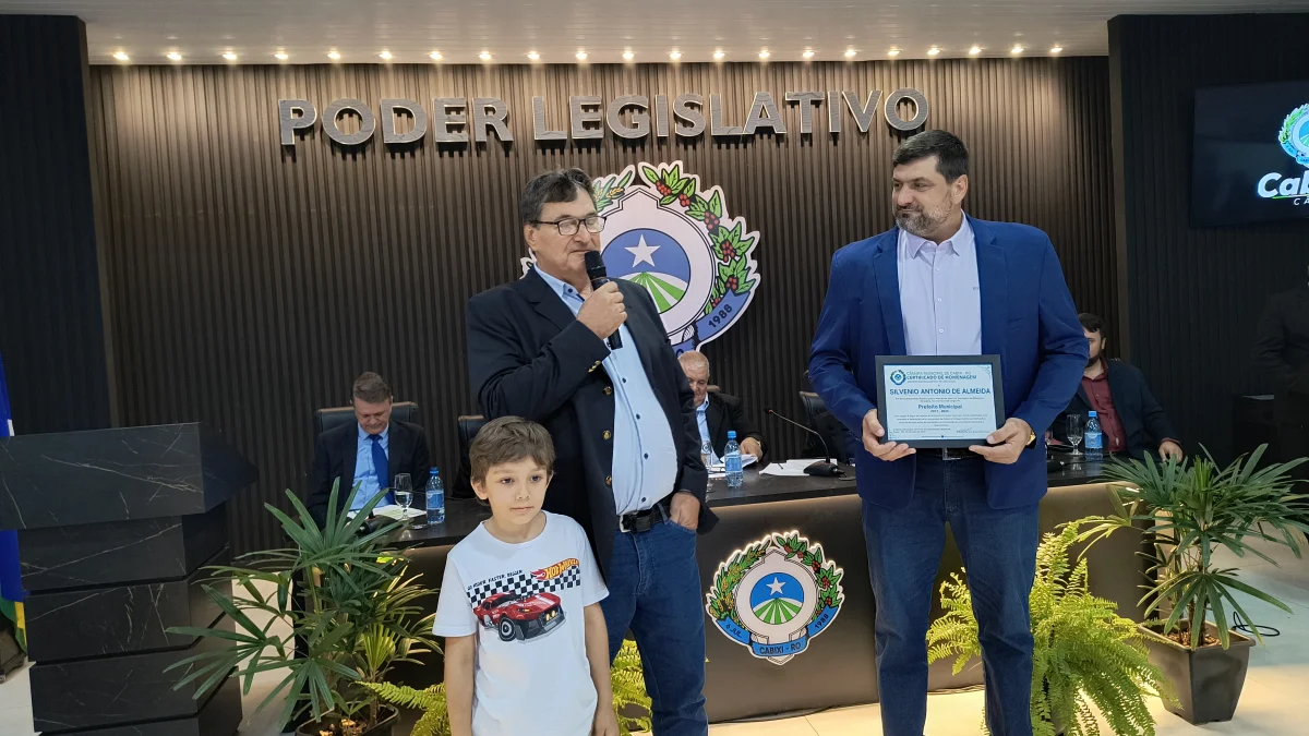 O presidente da Câmara de Vereadores do Município de Cabixi, Milton Antunes da Silva, concede homenagem ao empresário Antônio José Gemelli. A homenagem reconhece sua contribuição para o desenvolvimento econômico e social da cidade, especialmente pela geração de empregos e investimentos locais.