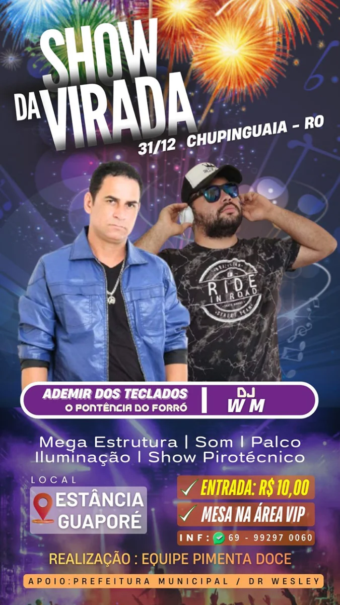A equipe da organização Pimenta Doce, está pronta para promover um dos eventos mais esperados do calendário chupinguaiense: O Réveillon do Show da Virada 2026, na Estância Guaporé, já consolida os organizadores da equipe Pimenta Doce, no município, promete uma virada de ano marcada por alegria, boa música e segurança, convidando moradores e visitantes para celebrar em grande estilo.
