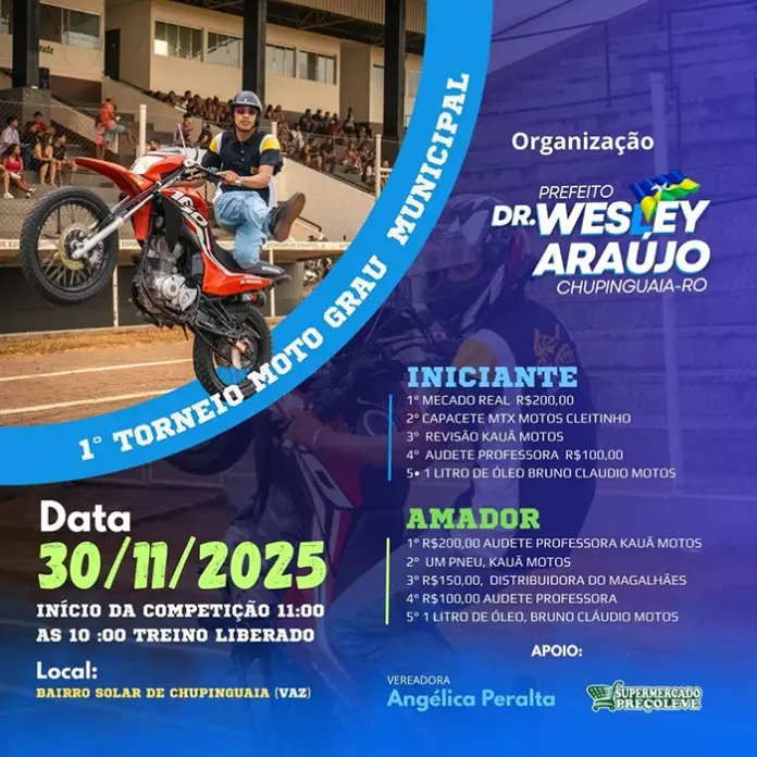 O prefeito do município de Chupinguaia, Dr. Wesley Araujo (PP), está organizando o 1° torneio de “Moto Grau” municipal, pois a prática de “grau”, com a premiação de recursos próprios e ajuda de comerciantes do município e contará com apresentações de manobras radicais, “racha de som”, além de premiações para os participantes. Segundo o prefeito Dr. Wesley Araújo, o torneio é o primeiro evento promovido na cidade. A festa será neste domingo, 30, no final do evento do Velocross Municipal.