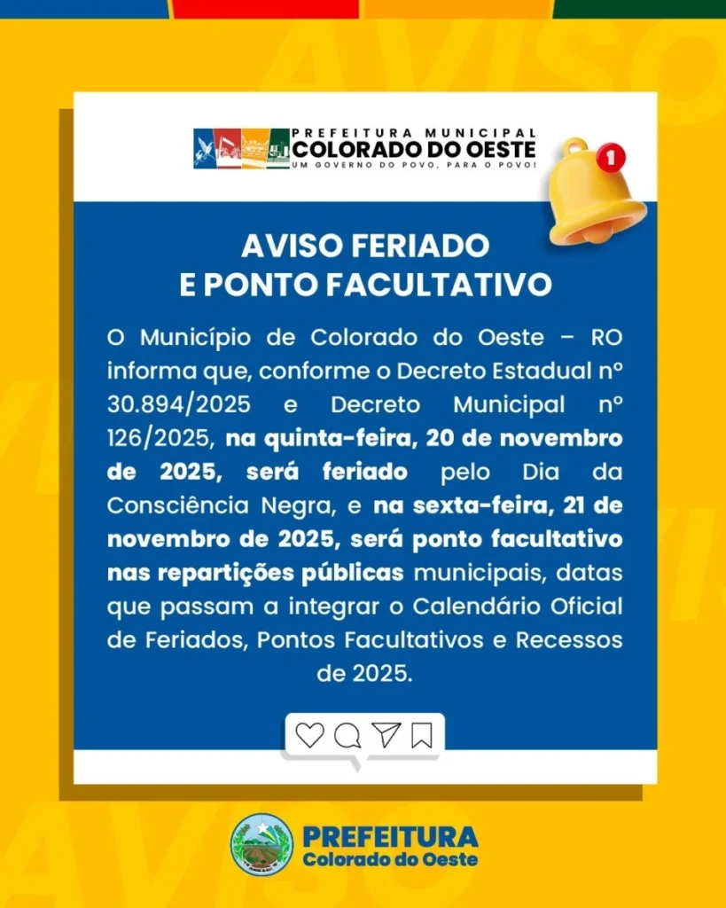 A Prefeitura Municipal de Colorado do Oeste informa que, conforme o Decreto Estadual nº 30.894/2025 e o Decreto Municipal nº 126/2025, quinta-feira, 20 de novembro, será feriado em razão do Dia da Consciência Negra.