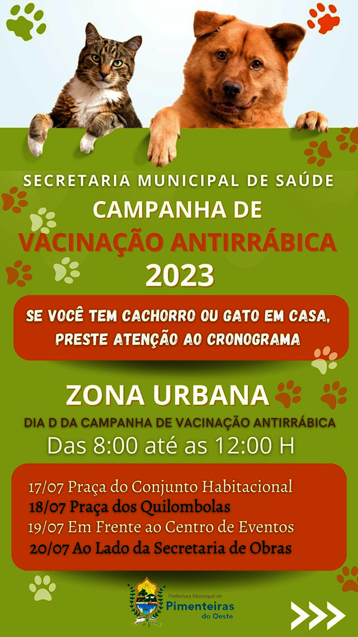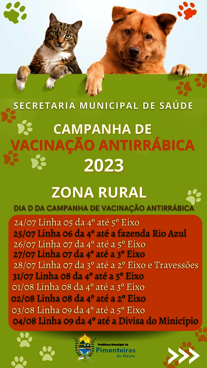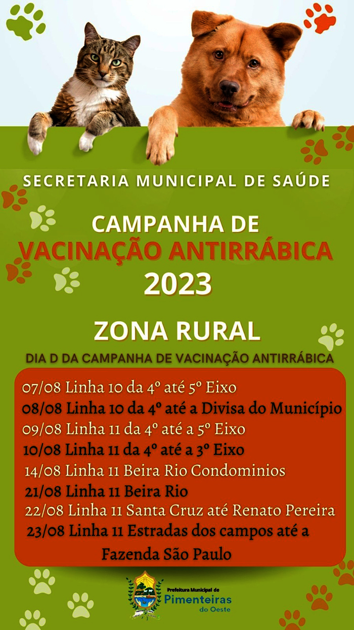 A Prefeitura Municipal de Pimenteiras do Oeste/RO; através da Secretaria Municipal de Saúde – Semusa, iniciou nesta segunda-feira (17/-07) a campanha municipal de vacinação antirrábica, na área urbana e área rural do município de 2023, nesta semana está acontecendo na área urbana e a partir de segunda-feira (24) será na área rural, que vai até o dia 23 de agosto.