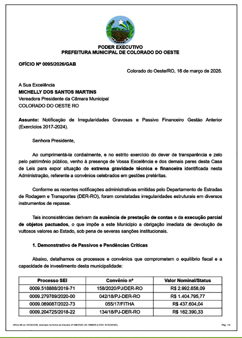 No documento obtido pelo Extra de Rondônia e enviado em 16 de março à presidente da Casa de Leis, Michelly dos Santos Martins (PRD), Edinho, alertou aos parlamentares para uma “situação de extrema gravidade técnica e financeira” identifica na administração, referente a irregulares em repasses envolvendo o Departamento de Estradas e Rodagens e Transportes (DER/RO).
